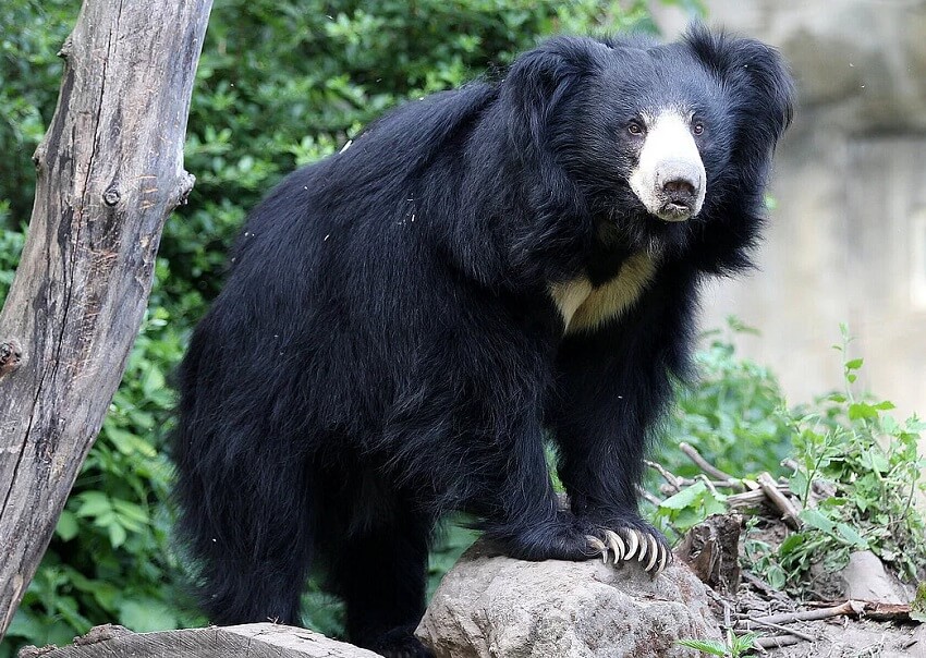 Sloth bears are native to the Indian subcontinent and are found throughout India, Sri Lanka, and Nepal. They are omnivores, primarily feeding on fruits, termites, and ants. The species often uses its long lower lip to suck up insects. Their curved claws are also perfect for digging into termite and ant mounds. Due to habitat loss, the IUCN has listed this species as vulnerable to extinction.