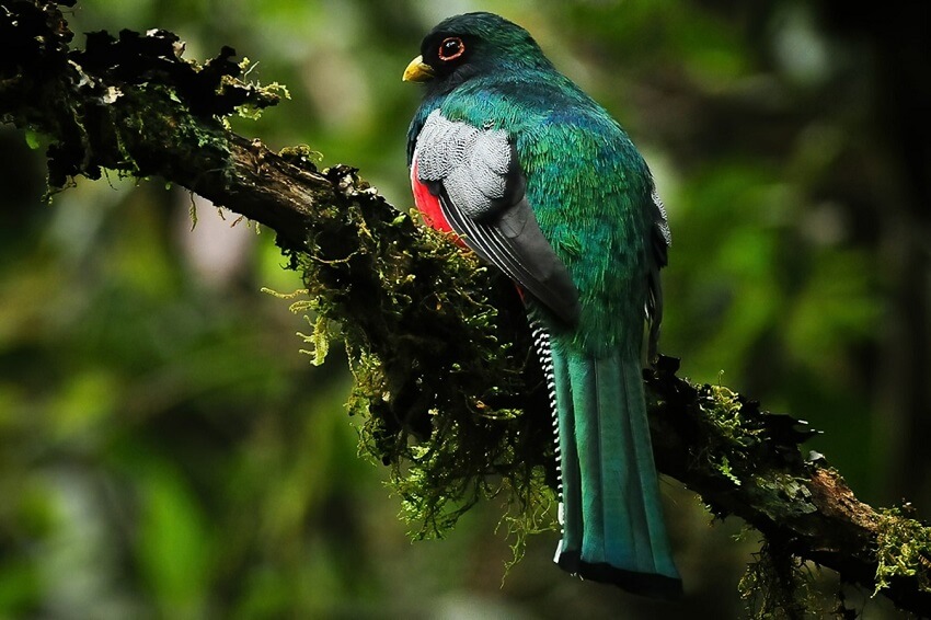 The Masked Trogon lives in moist highland forests. The male bird is typically brighter than the female, which has a white ring around its eyes.