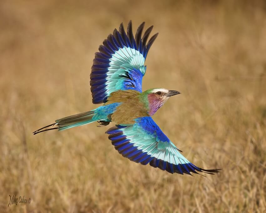 The Lilac-breasted Roller (Coracias caudatus) stands 37 cm tall. Both males and females have a lilac neck and chest, a turquoise belly, a green head, an orange-red face, and a royal blue tail tip. They live throughout eastern and southern Africa, from Ethiopia and Angola to northern South Africa.