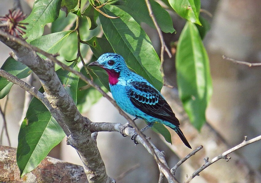 The Spangled Cotinga (Cotinga cayana) is a tropical bird that lives in the forests and jungles of northern South America, including the Amazon rainforest in Brazil. The male has striking pale blue plumage on its chest and belly, blue-black wings, and a bright red throat. This species measures 18 to 23 cm in length.
