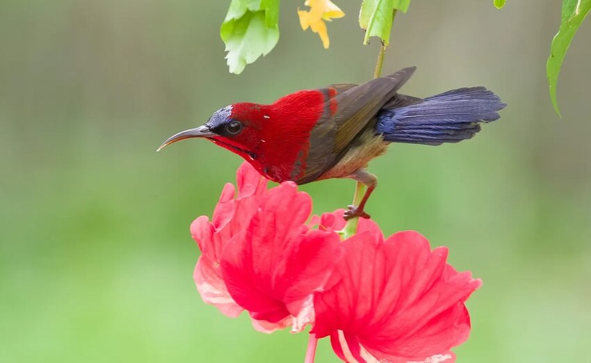 The Crimson Sunbird lives in African countries like Burundi, the Congo, and some neighboring nations.